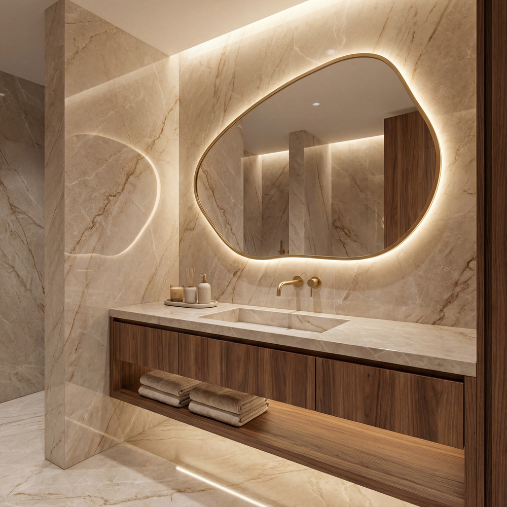 Dieses Design vereint zeitlose runde Ästhetik mit exklusiven Rahmenoptionen und sanfter Hintergrundbeleuchtung für eine luxuriöse Atmosphäre, die herkömmliche Modelle weit hinter sich lässt.